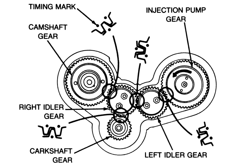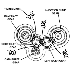 | Fig. 2: View of the timing gear alignment on the diesel engine. To avoid confusion, note that the left idler gear has one set of double marks and one single mark, while the right idler gear has two sets of single marks and one set of double marks — all gears are installed with the marks facing outward |