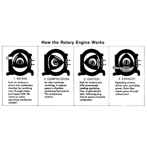 Ignition of the compressed fuel/air mixture occurs each time a side of the rotor passes the spark plugs. Since the rotor has three sides there are three complete power impulses for each complete revolution of the rotor. As it moves, the rotor experts pressure on the cam of the eccentric shaft, causing the shaft to turn.