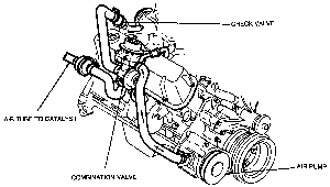 Models sold in California have an air pump, a check valve, and an air control valve. The air control valve has a no. 1 relief valve, activated by intake manifold vacuum, and a No. 2 relief valve, which modulates the amount of secondary air. The No. 2 relief valve is not used with automatic transmissions.