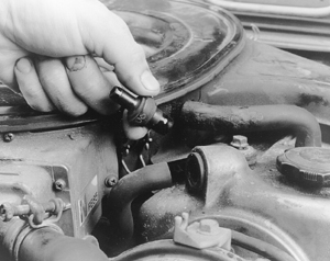 Fig. 1: Once its hose is disconnected, pull the PCV valve out of the valve cover — push-in style shown