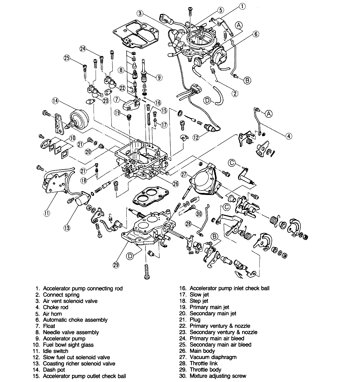 | Fig. 4: Exploded view of the carburetor used on the 1,998cc engine |