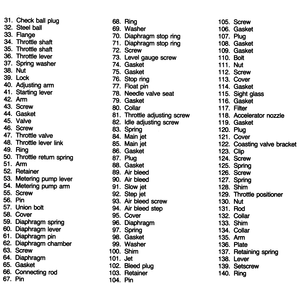 Overhaul your carburetor in a clean, dust-free area. Carefully disassemble the carburetor, referring often to the exploded views. Keep all similar and look alike parts segregated during disassembly and cleaning to avoid accidental interchange during assembly. Make a note of all jet sizes.