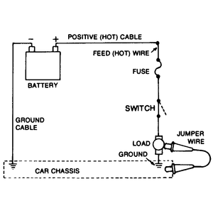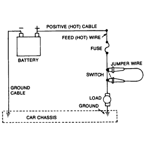 Jumper wires are used primarily to locate open electrical circuits, on either the ground (–) side of the circuit or on the hot (+) side. If an electrical component fails to operate, connect the jumper wire between the component and a good ground. If the component operates only with the jumper installed, the ground circuit is open. If the ground circuit is good, but the component does not operate, the circuit between the power feed and component may be open. By moving the jumper wire successively back from the lamp toward the power source, you can isolate the area of the circuit where the open is located. When the component stops functioning, or the power is cut off, the open is in the segment of wire between the jumper and the point previously tested.