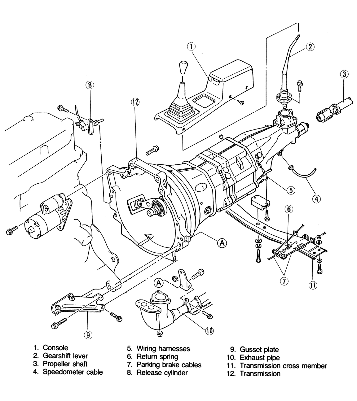 Install the rear transmission mount on the crossmember. Bolt the transmission