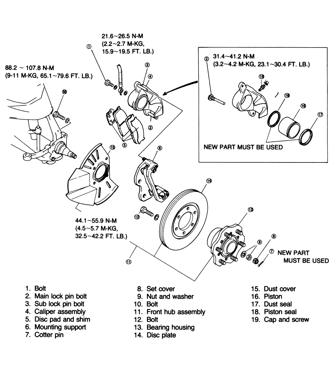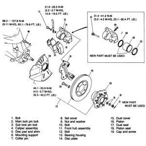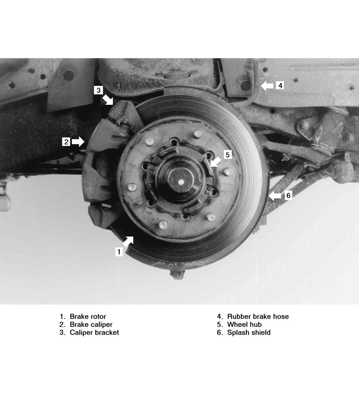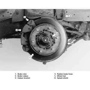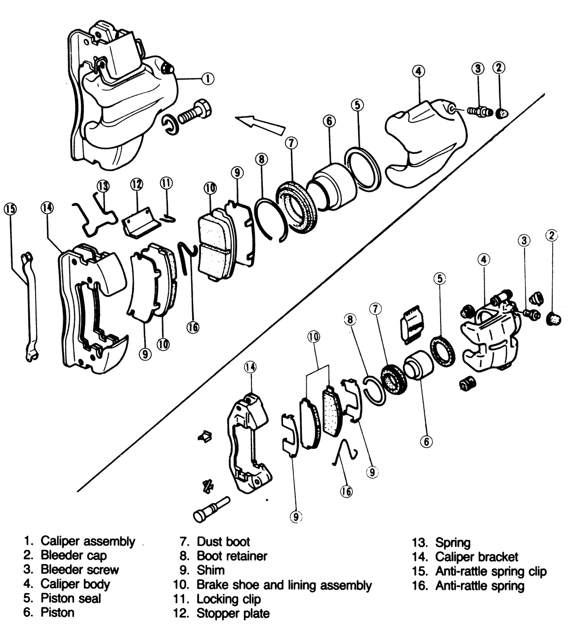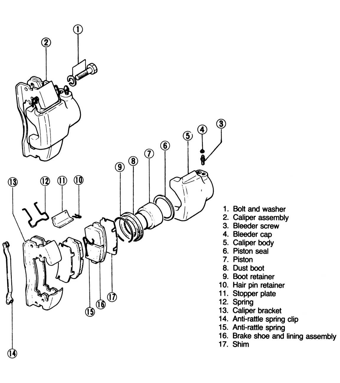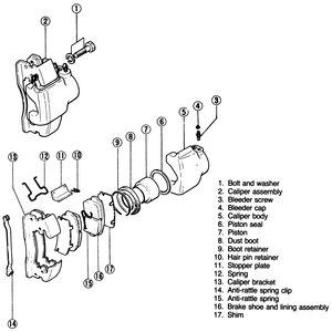 | Fig. 4: Exploded view of a 1986 model's disc brake assembly |