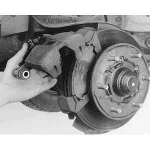 | Fig. 6: Remove the lower caliper mounting bolt and loosen