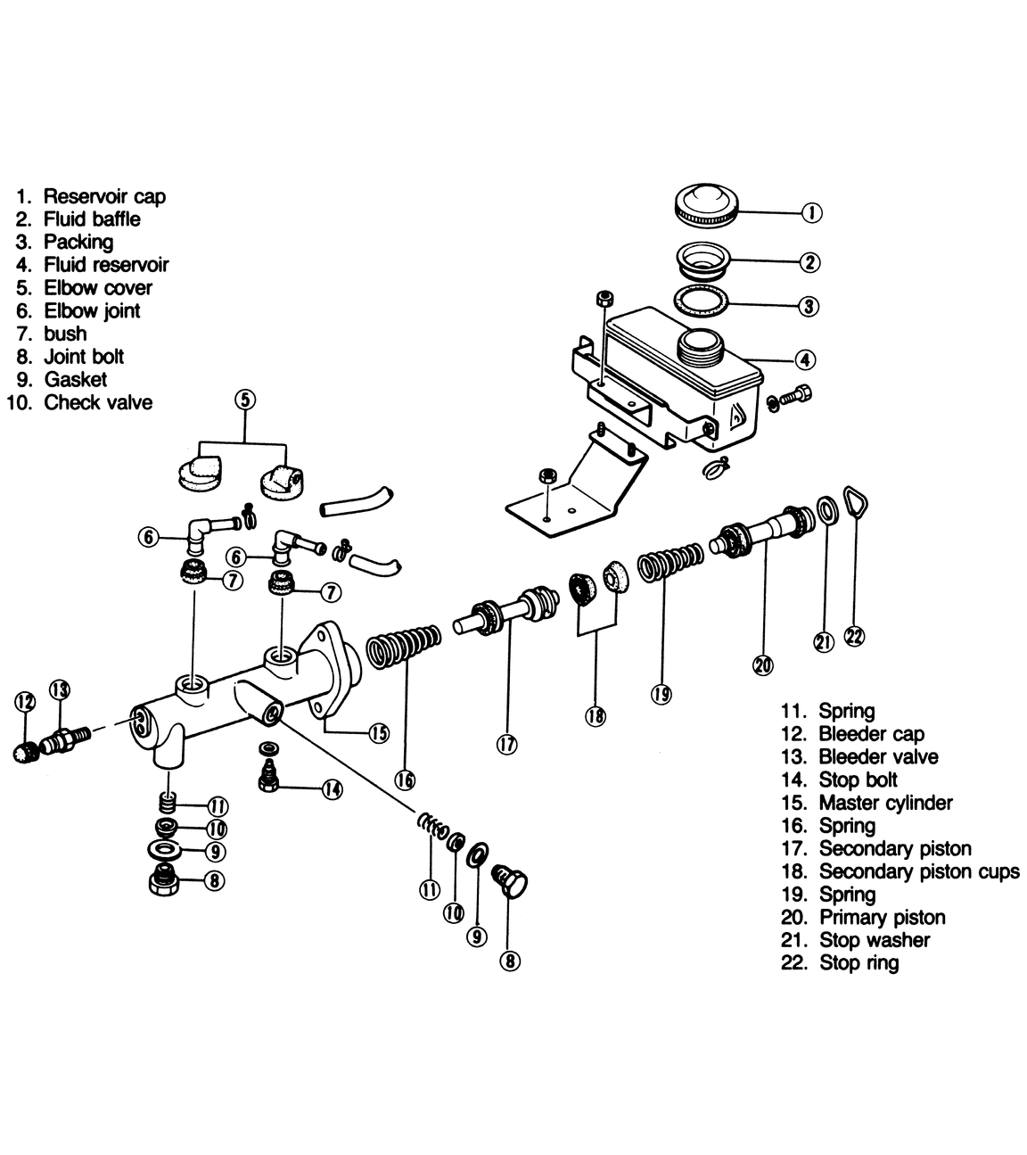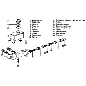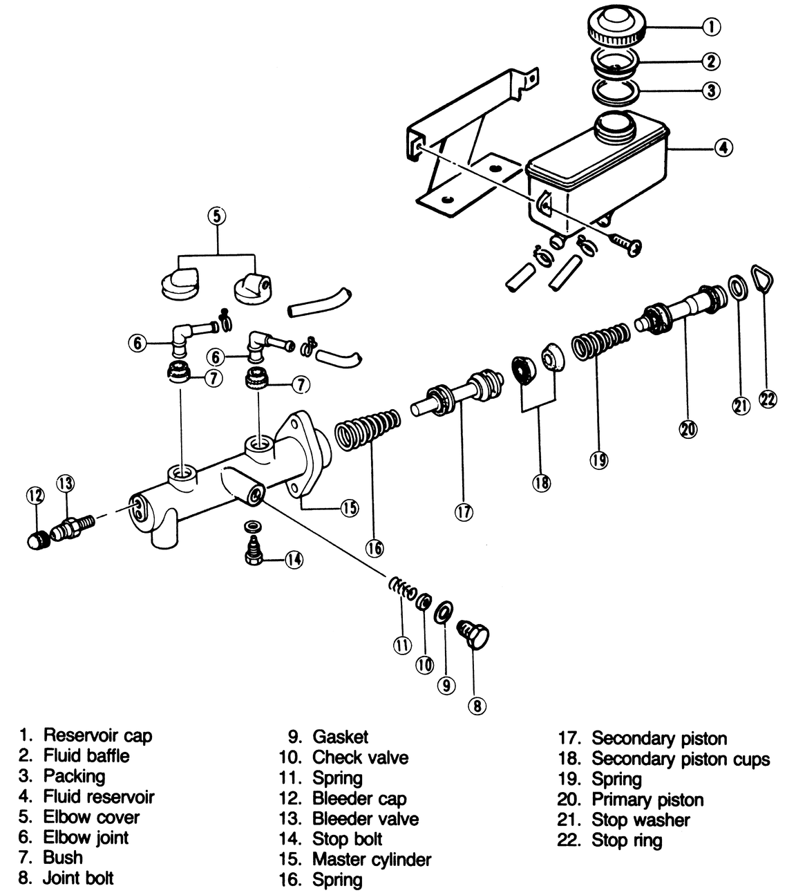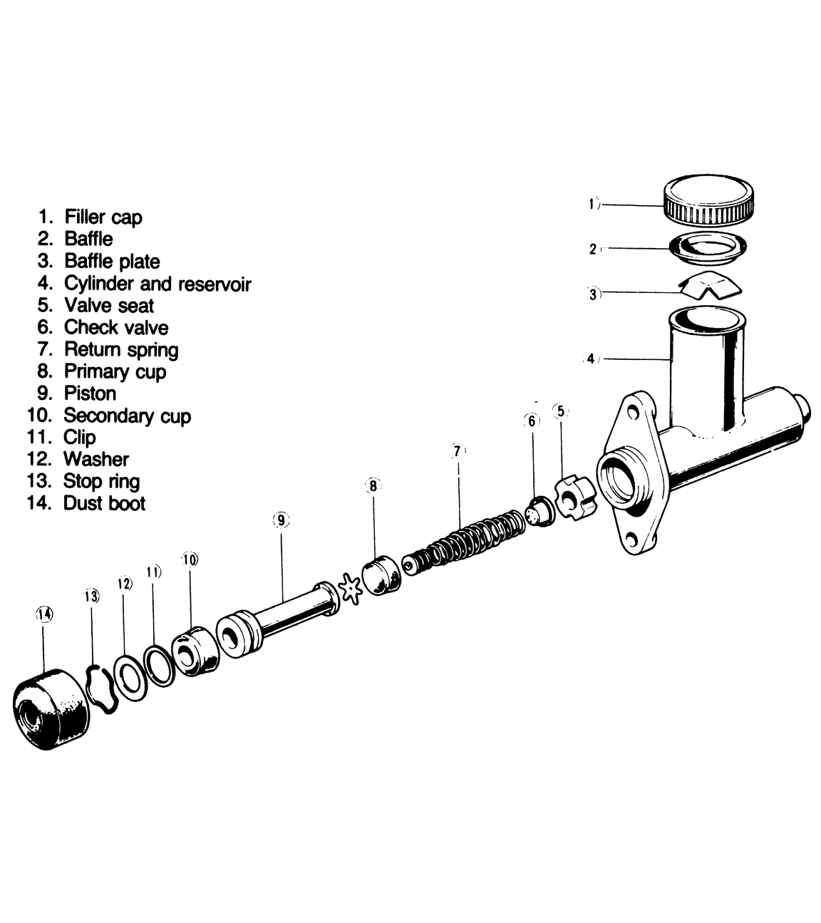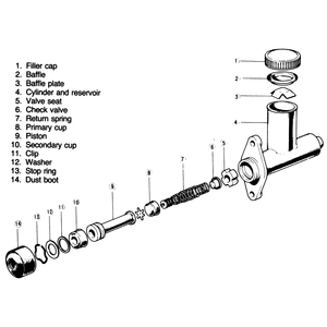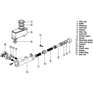 | Fig. 1: Exploded view of the early 1972 B1600 master cylinder |