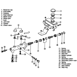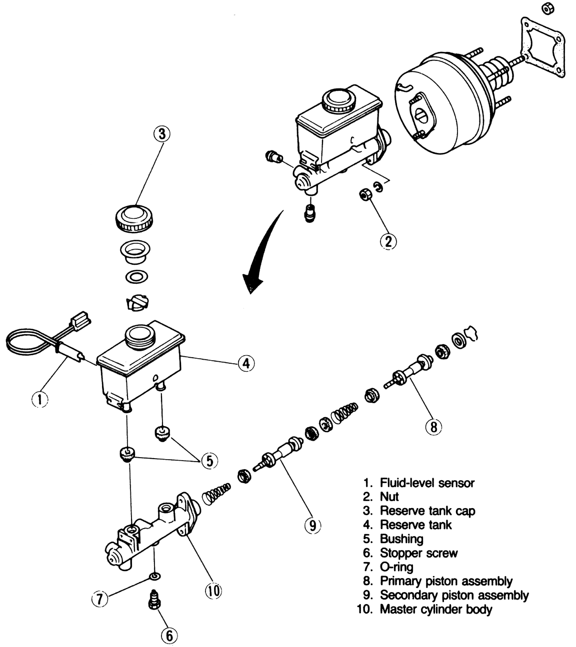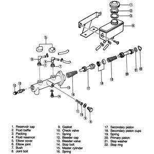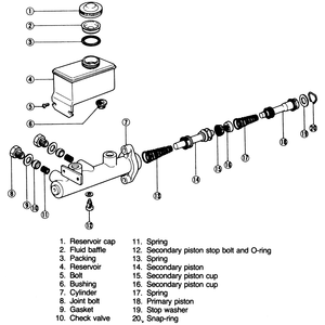| Fig. 10: Exploded view of the 1986 master cylinder |