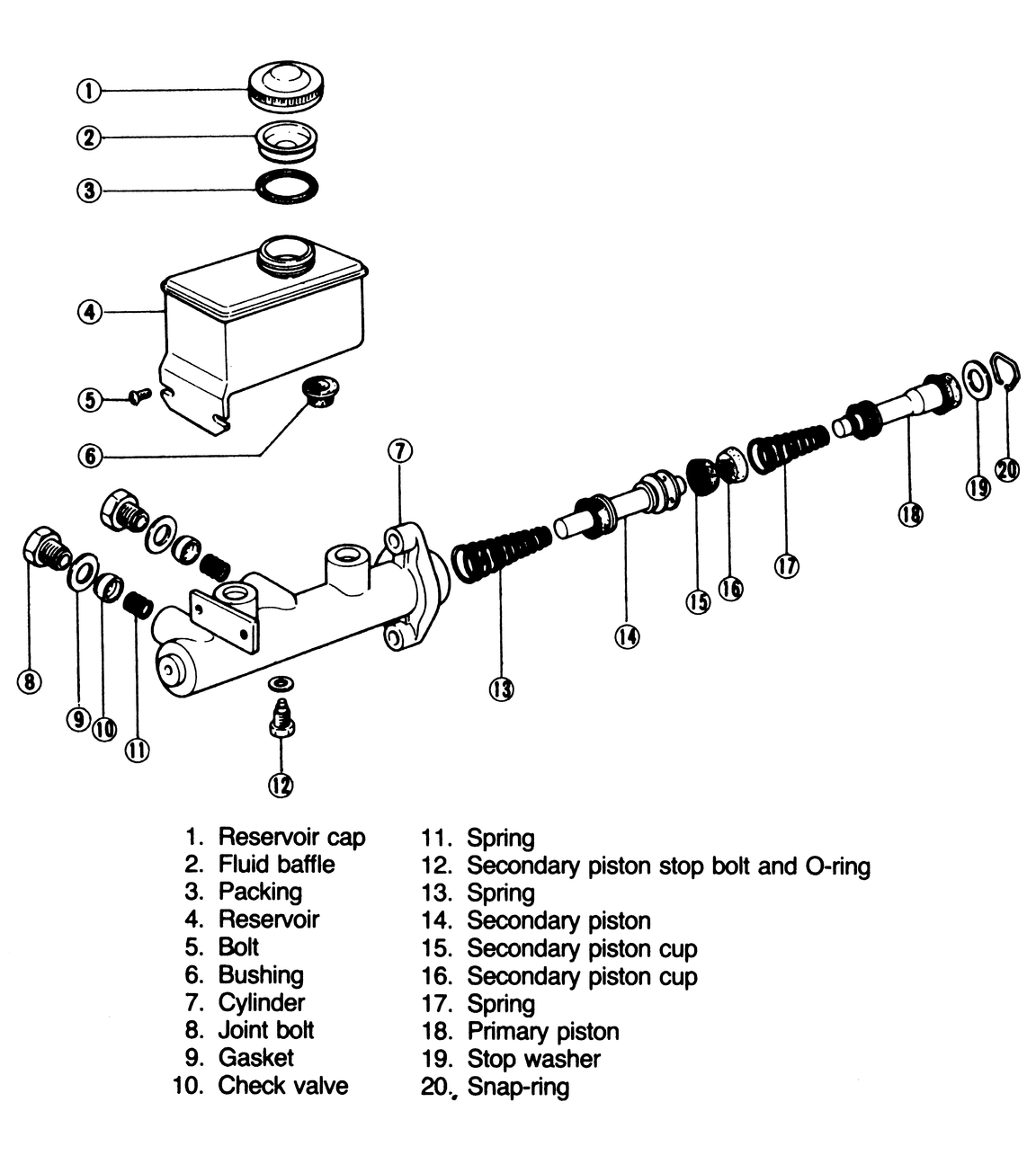 | Fig. 6: Exploded view of the 1979–80 master cylinder |