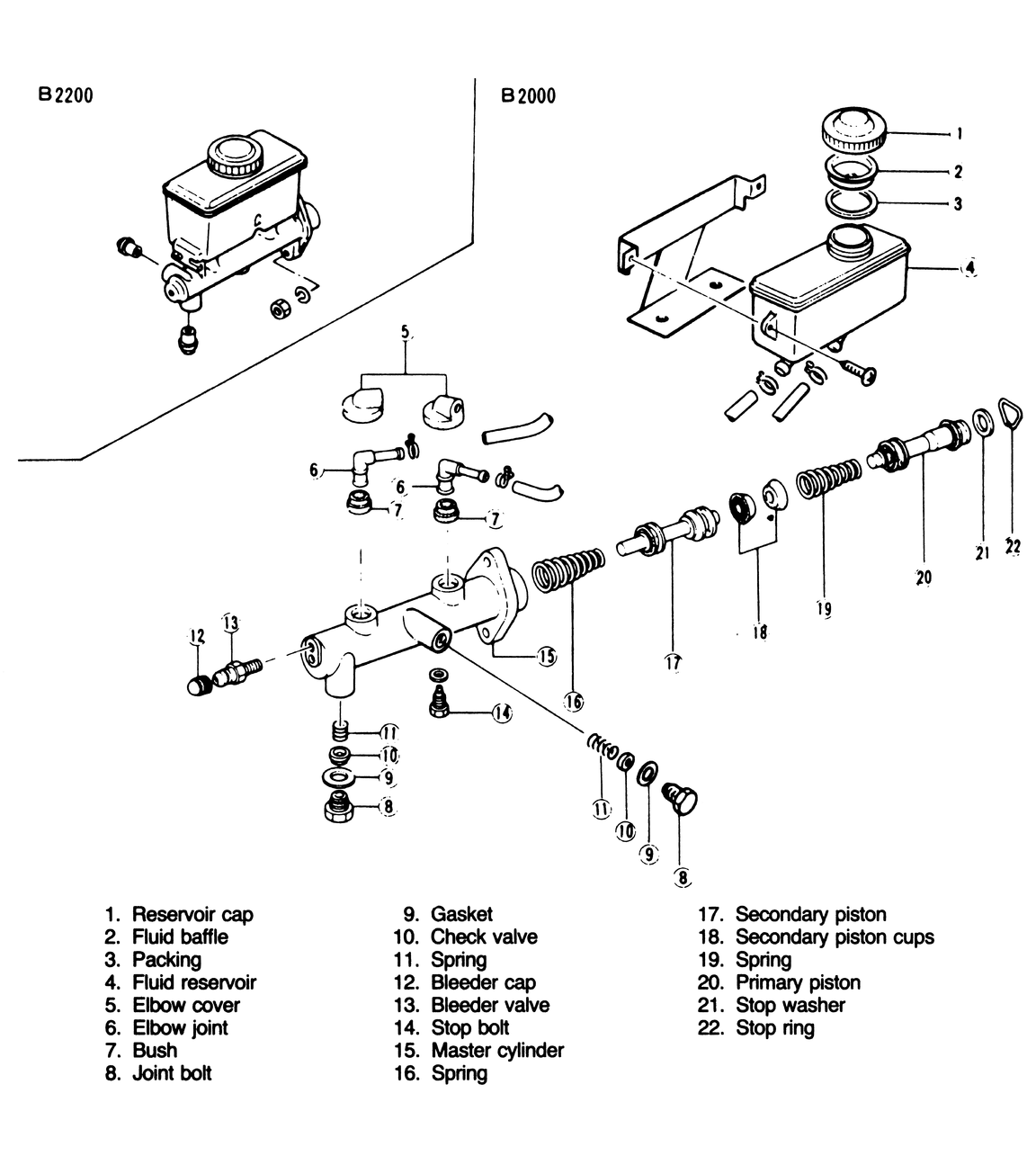 | Fig. 8: Exploded view of the 1982–84 B2000 and B2200 master cylinder |