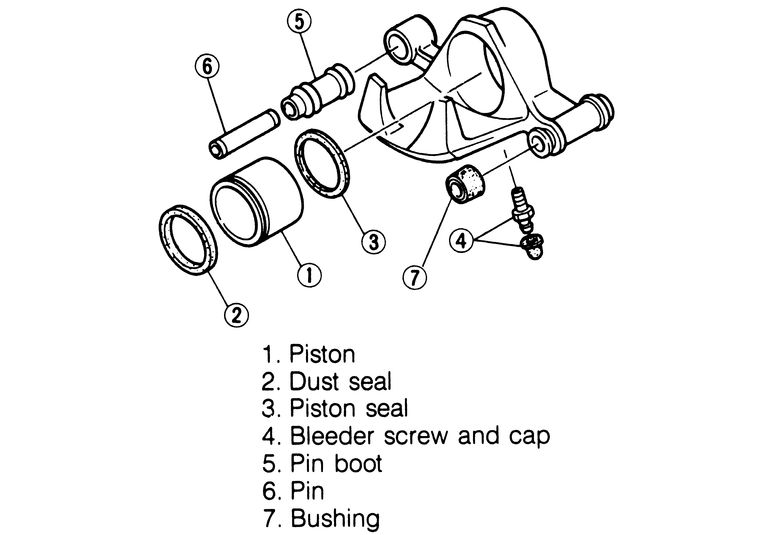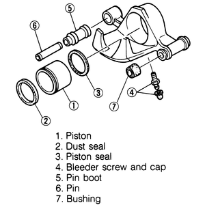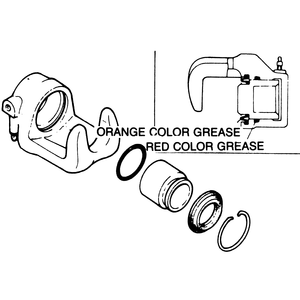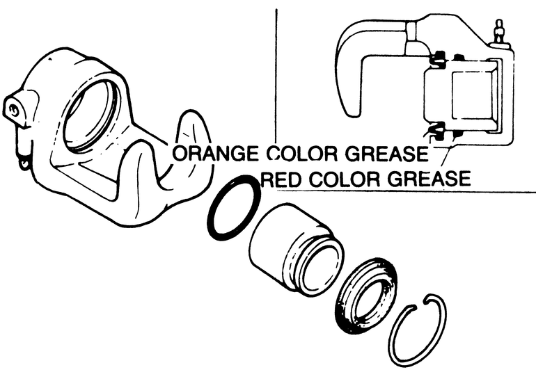 | Fig. 5: Exploded view of the piston components — inset shows location of the color coded grease application points |