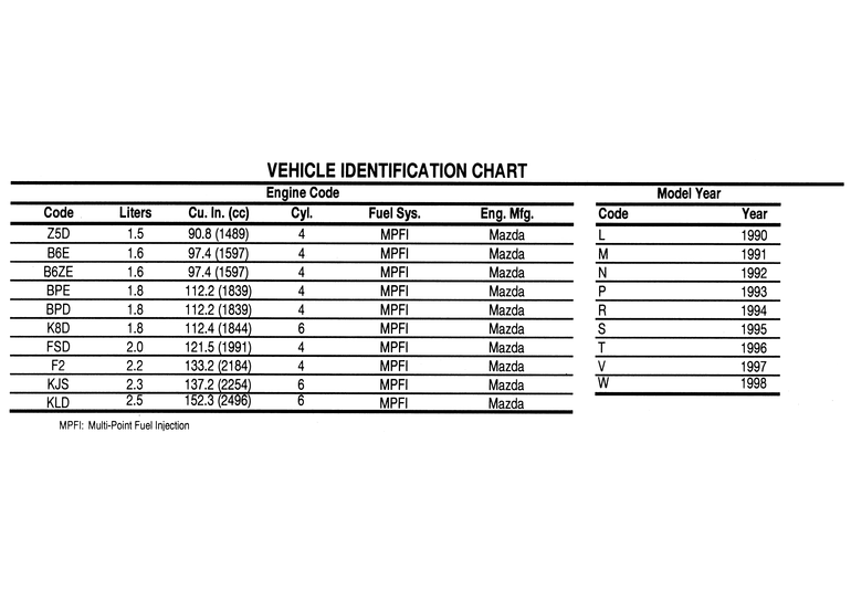 The VIN is a 17 digit combination of numbers and letters. The first 3 digits represent the world manufacturer identifier which is Mazda. The 5th digit is a passenger car identifier, indicating the vehicle is imported from outside North America or built by another manufacturer in North America for Mazda. The 9th digit is a check digit for all vehicles. The 10th digit indicates the model year: L for 1990, M for 1991, N for 1992, P for 1993, etc. The 11th digit is the assembly plant code. The 12th through 17th digits indicate the production sequence number.