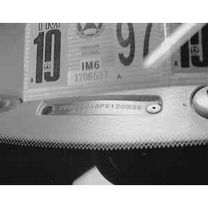 The Vehicle Identification Number (VIN) is stamped on a metal plate that is riveted to the instrument panel adjacent to the windshield. It can be seen by looking through the lower corner of the windshield on the driver's side. The VIN number is also stamped on the firewall directly behind the engine.