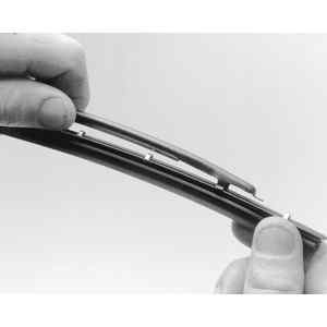 To replace the Tridon? refill, it is necessary to remove the wiper blade. This refill has a plastic backing strip with a notch about 1 in. (25mm) from the end. Hold the blade (frame) on a hard surface so that the frame is tightly bowed. Grip the tip of the backing strip and pull up while twisting counterclockwise. The backing strip will snap out of the retaining tab. Do this for the remaining tabs until the refill is free of the blade. The length of these refills is molded into the end and they should be replaced with identical types.