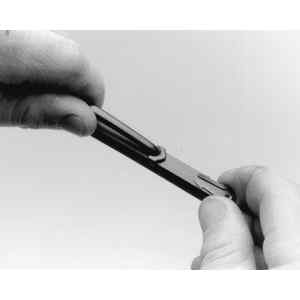 Other types of Trico? refills have two metal tabs which are unlocked by squeezing them together. The rubber filler can then be withdrawn from the frame jaws. A new refill is installed by inserting the refill into the front frame jaws and sliding it rearward to engage the remaining frame jaws. There are usually four jaws; be certain when installing that the refill is engaged in all of them. At the end of its travel, the tabs will lock into place on the front jaws of the wiper blade frame.