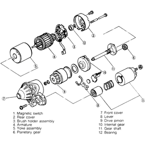 | Fig. 1: Exploded view of a typical starter assembly showing magnetic switch mounting details |