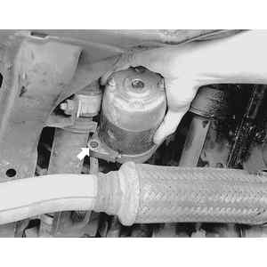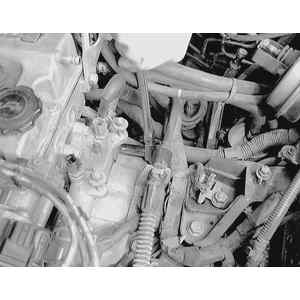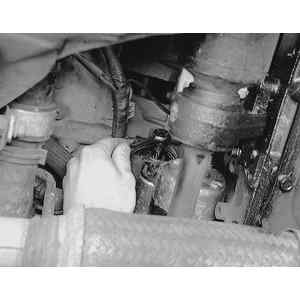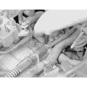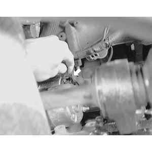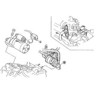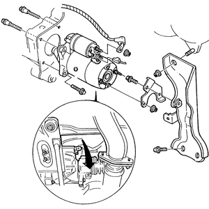 | Fig. 9: Remove the lower starter motor mounting bolt