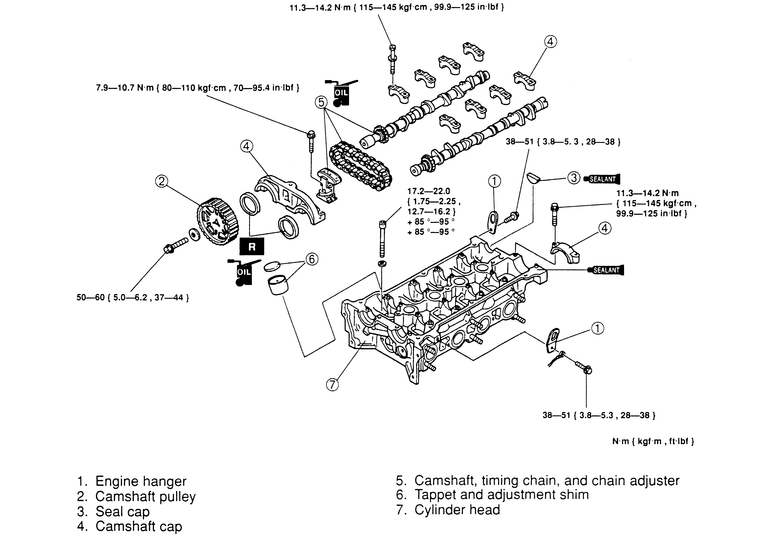 - Install the camshaft sprockets. Tighten the mounting bolts to 91–103