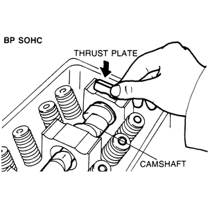 - Install the camshaft thrust plate. On the 1.6L 8-valve engine, tighten the