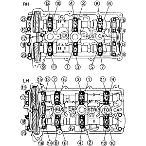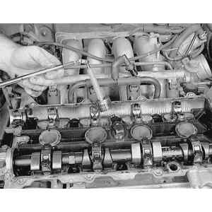 - Loosen the camshaft cap bolts in 5–6 steps, in the reverse order of