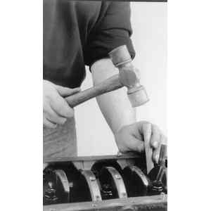 Again, rotate the engine, this time to position the number one cylinder bore (head surface) up. Turn the crankshaft until the number one piston is at the bottom of its travel, this should allow the maximum access to its connecting rod. Remove the number one connecting rods fasteners and cap and place two lengths of rubber hose over the rod bolts/studs to protect the crankshaft from damage. Using a sturdy wooden dowel and a hammer, push the connecting rod up about 1 in. (25mm) from the crankshaft and remove the upper bearing insert. Continue pushing or tapping the connecting rod up until the piston rings are out of the cylinder bore. Remove the piston and rod by hand, put the upper half of the bearing insert back into the rod, install the cap with its bearing insert installed, and hand-tighten the cap fasteners. If the parts are kept in order in this manner, they will not get lost and you will be able to tell which bearings came form what cylinder if any problems are discovered and diagnosis is necessary. Remove all the other piston assemblies in the same manner. On V-style engines, remove all of the pistons from one bank, then reposition the engine with the other cylinder bank head surface up, and remove that banks piston assemblies.