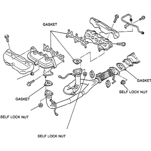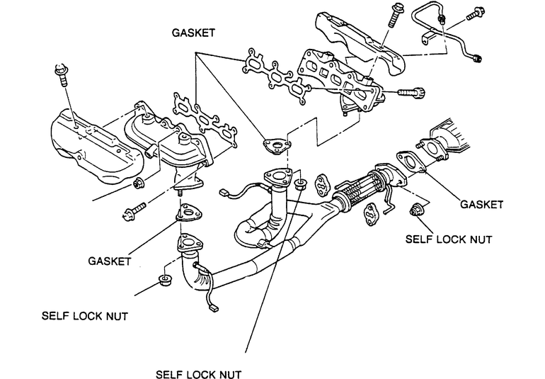 | Fig. 1: Exploded view of the exhaust manifolds for the 1.8L (K8) and 2.5L engines — 2.3L engine is similar |