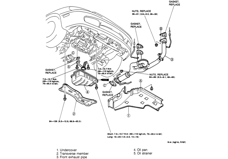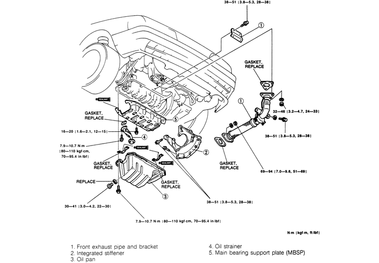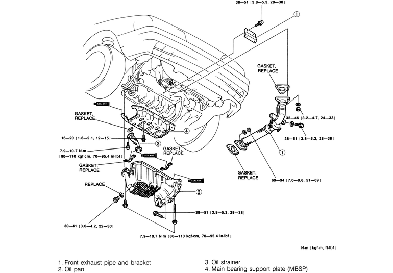 | Fig. 4: Exploded view of the oil pan and related components for the 1.8L (K8), 2.3L and 2.5L engines |