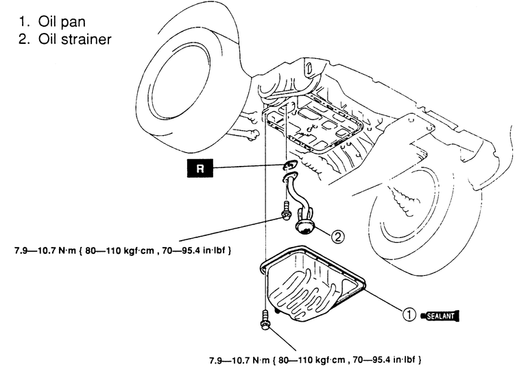 | Fig. 2: Exploded view of the oil pan and related components for the 1.8L engine |