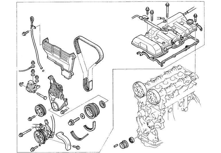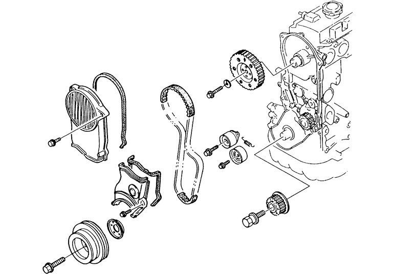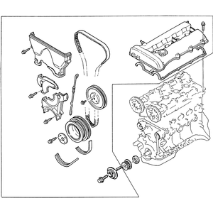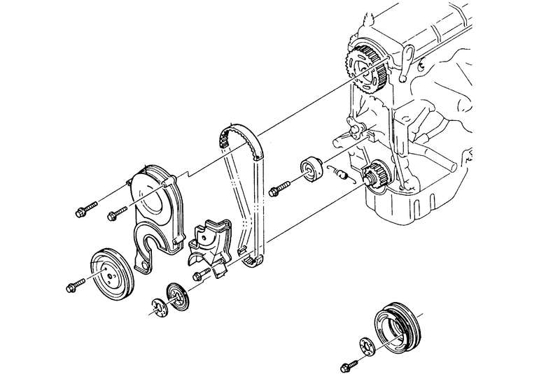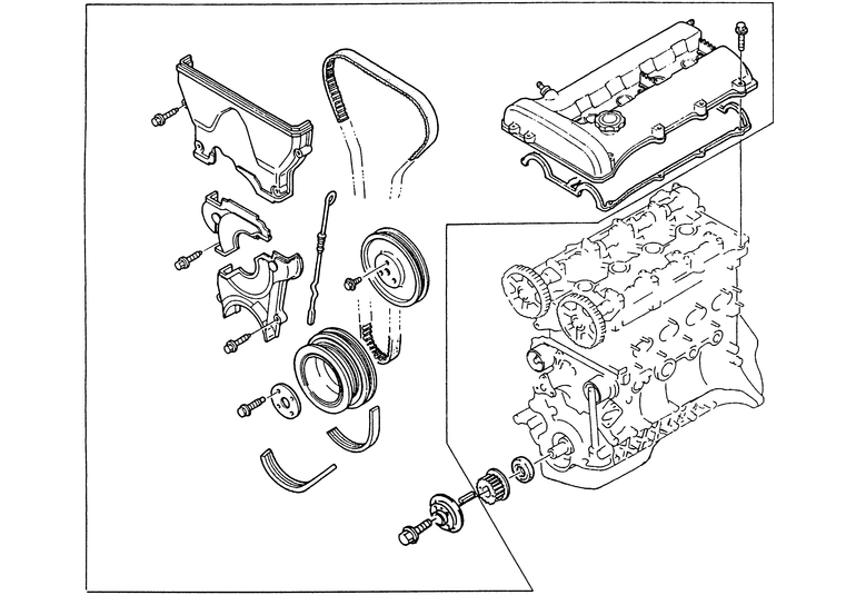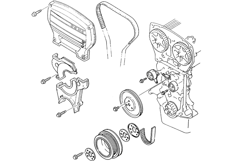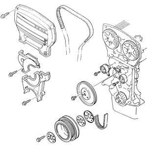 | Fig. 1: Exploded view of the 1990–94 1.6L and 1.8L SOHC timing belt cover assembly |