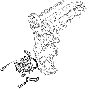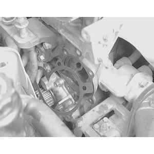 | Fig. 7: Remove the water pump attaching bolts . .