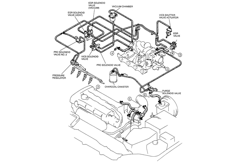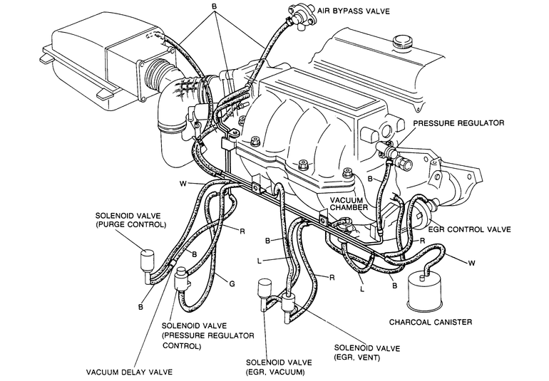 Following are vacuum diagrams for most of the engine and emissions package combinations covered by this manual. Because vacuum circuits will vary based on various engine and vehicle options, always refer first to the vehicle emission control information label, if present. Should the label be missing, or should vehicle be equipped with a different engine from the vehicle's original equipment, refer to the diagrams below for the same or similar configuration.