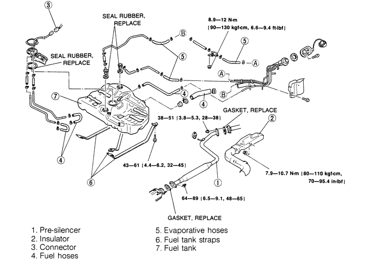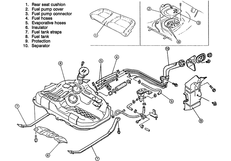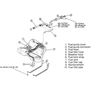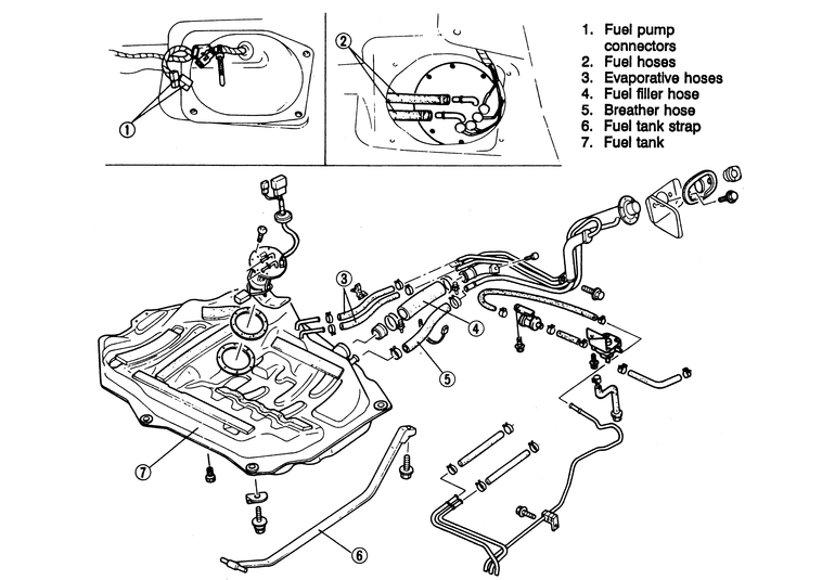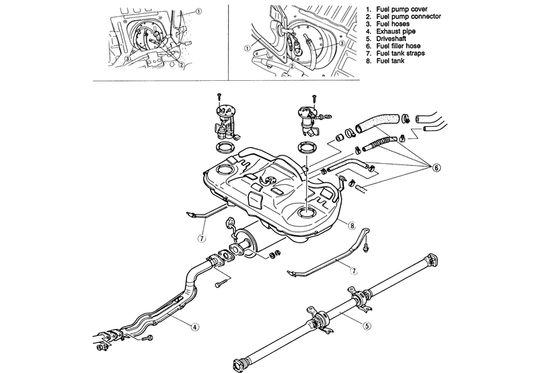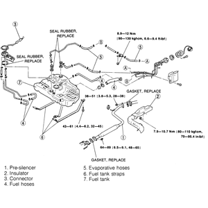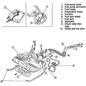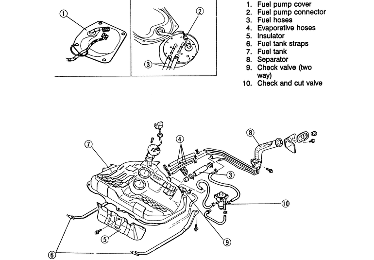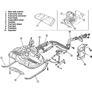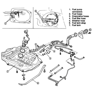 | Fig. 4: Exploded view of the 1990–92 626 and MX-6 fuel tank assembly |