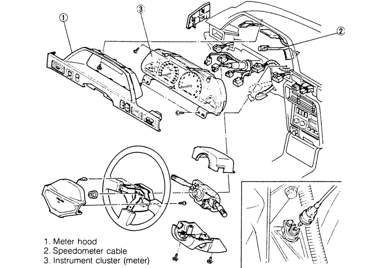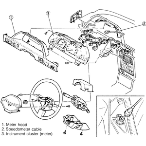 | Fig. 1: Exploded view of the 1990–94 323 and Protege instrument cluster assembly. Other models are similar |