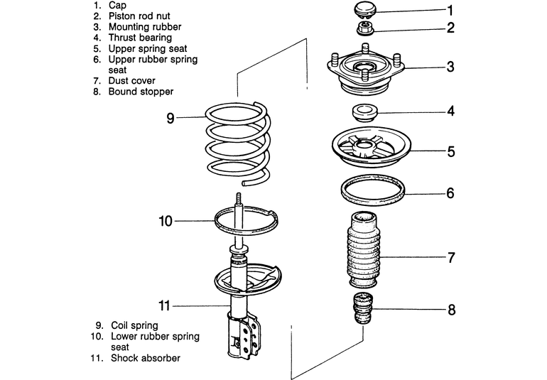 | Fig. 1: Exploded view of the front strut assembly. Rear strut is similar |