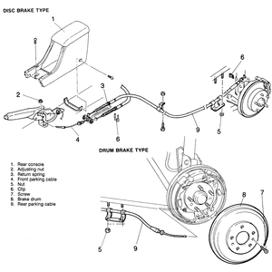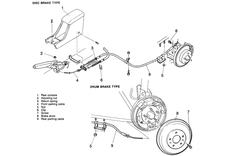 Loosen the cable adjusting nut at the parking brake handle. Disconnect the