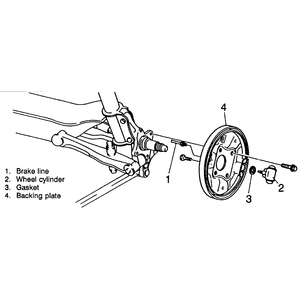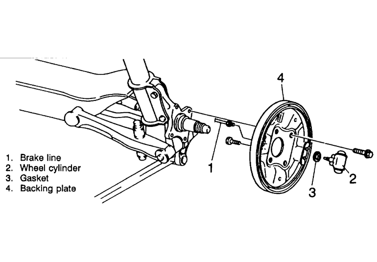 | Fig. 1: Rear drum brake backing plate assembly and wheel cylinder |