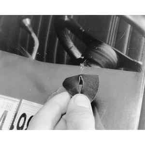 Although severely cracked or damaged windshields must be replaced, there is something that you can do to prolong or even prevent the need for replacement of a chipped windshield. There are many companies which offer windshield chip repair products, such as Loctite'sBullseyewindshield repair kit. These kits usually consist of a syringe, pedestal and a sealing adhesive. The syringe is mounted on the pedestal and is used to create a vacuum which pulls the plastic layer against the glass. This helps make the chip transparent. The adhesive is then injected which seals the chip and helps to prevent further stress cracks from developing. Refer to the sequence of photos to get a general idea of what windshield chip repair involves.