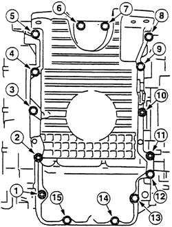 Oil pan bolts. Loosen the bolts in reverse of the tightening sequence