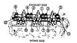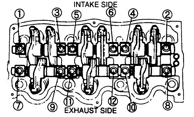 | Fig. 2: Rocker arm/shaft retaining bolt tightening sequence — 3.0L engine |