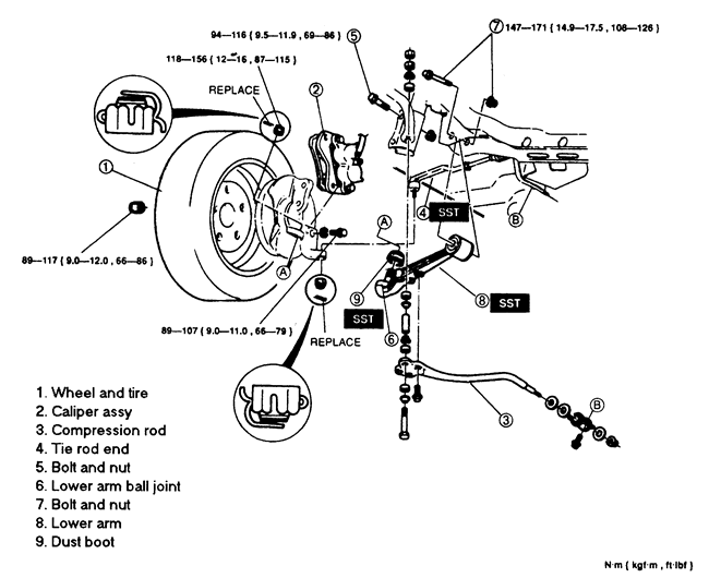 Lower ball joint. Tighten the nut to 87–115 ft. lbs. (118–156 Nm).