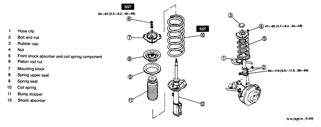 Strut assembly. Tighten the upper strut mount nuts to 34–46 ft. lbs. (47–62 Nm) and the steering knuckle bolts to 69–86 ft. lbs. (94–116 Nm).