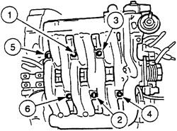 Fig. 10: Tighten the upper manifold bolts in the sequence shown — 2.3L engine