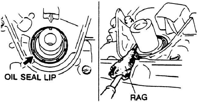 | Fig. 1: Remove the front engine seal by cutting the seal lip, then, so as not to damage the crankshaft, carefully pry the seal out with a prybar |