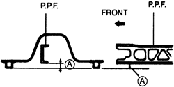 NOTE: After the frame installation, position a straightedge between the body frame members on each side of the vehicle. Measure the distance between the bottom of the frame to the straightedge; it should be 2.403–2.797 in. (61–71mm). If the distance is not as specified, reposition the frame member at the transmission.