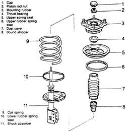 | Fig. 2: Exploded view of the front strut assembly — rear strut is similar |