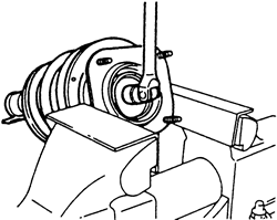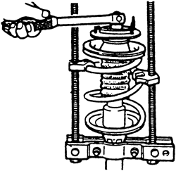 | Fig. 3: Secure the upper strut mount in a vise and loosen the piston rod nut one turn but do not remove it |