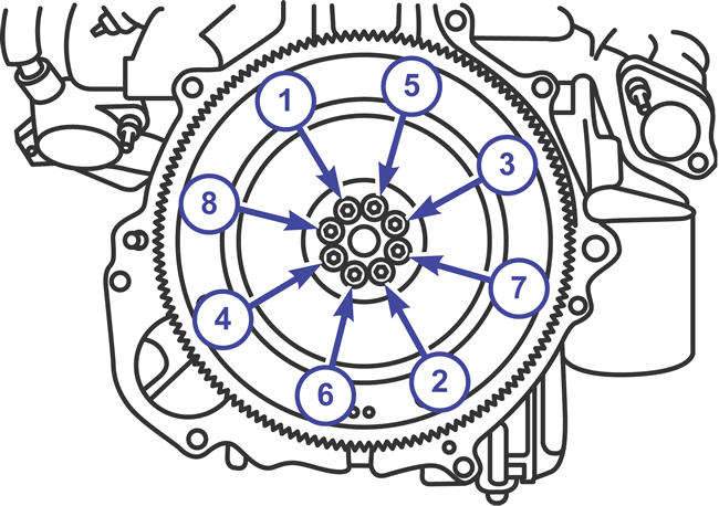 - Place the spacer and flexplate then install the bolts. Tighten the bolts in the sequence shown below according to the following steps: