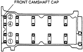| Fig. 13: Front camshaft cap bolt loosening sequence-2.3L and 2.5L engines |