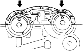 | Fig. 4: When installing the camshafts, align the marks on the camshaft gears with the colored/marked links of the chain-1.5L engine |