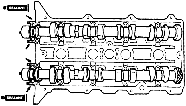 | Fig. 9: Apply silicone sealant to the cylinder head in the positions shown-1.8L (BP) and 2.0L engines |
